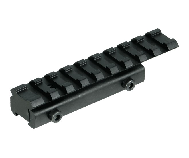 Это адаптер для перехода с призмы 11-12 мм на Weaver / Picatinny. Девять поперечных слотов для установки кронштейна. Высота между полками 13 мм. Длина установочной части на «ласточку» — 75 мм, длина верхней планки Weaver / Picatinny – 100 мм.