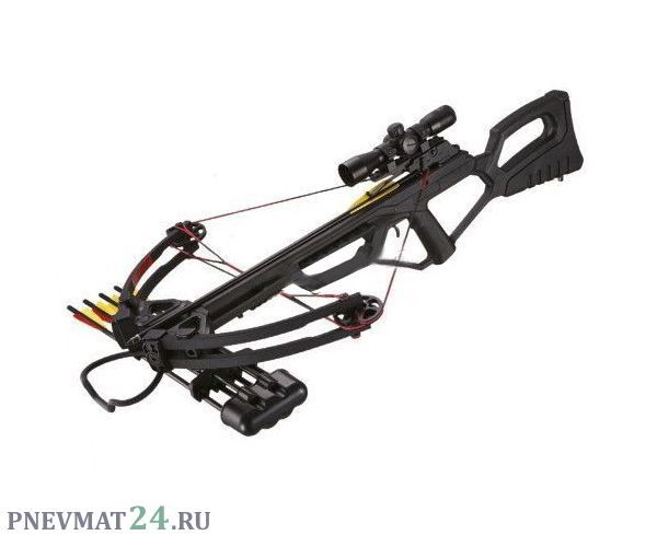 Цевье с прикладом представляют собой единую цельнолитую деталь. Приклад прорезиненный, регулируемый. Форма цевья усовершенствована для повышения удобства хвата. В комплектации – оптический прицел 4х32. Весит арбалет 3,2 кг, ширина его 55 см при длине 92 см. На выбор есть две комплектации (в базовой – прицел, воск и четыре стрелы, в расширенной комплектации добавлены кивер, ремень и ручной натяжитель).