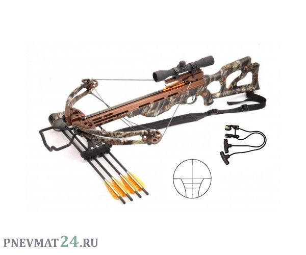Комплектация (?): арбалет, оптический прицел 4×32, воск, натяжитель, кивер на 4 стрелы, 4 карбоновые стрелы