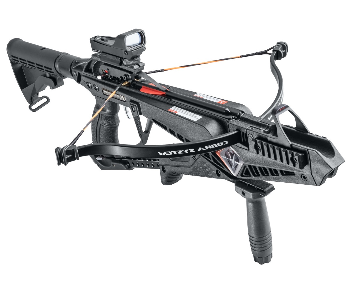В комплектацию входит коллиматорный прицел. На планки также можно установить любые аксессуары, а также тактическую рукоятку. Кроме того, арбалет имеет регулируемое по длине цевье.