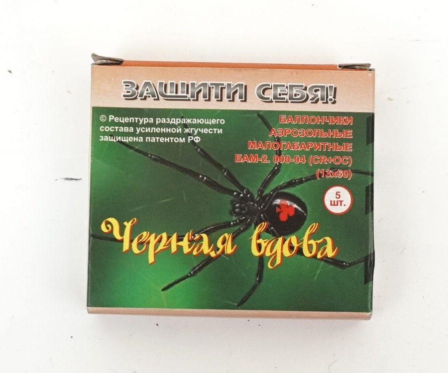 Баллончик аэрозольный малогабаритный «Черная вдова» является одним из самых мощных средств среди гражданских, разрешенных к использованию на территории Российской Федерации. Выпускается под размеры 13х50 и 13х60. Сочетает в себе три активных компонента: