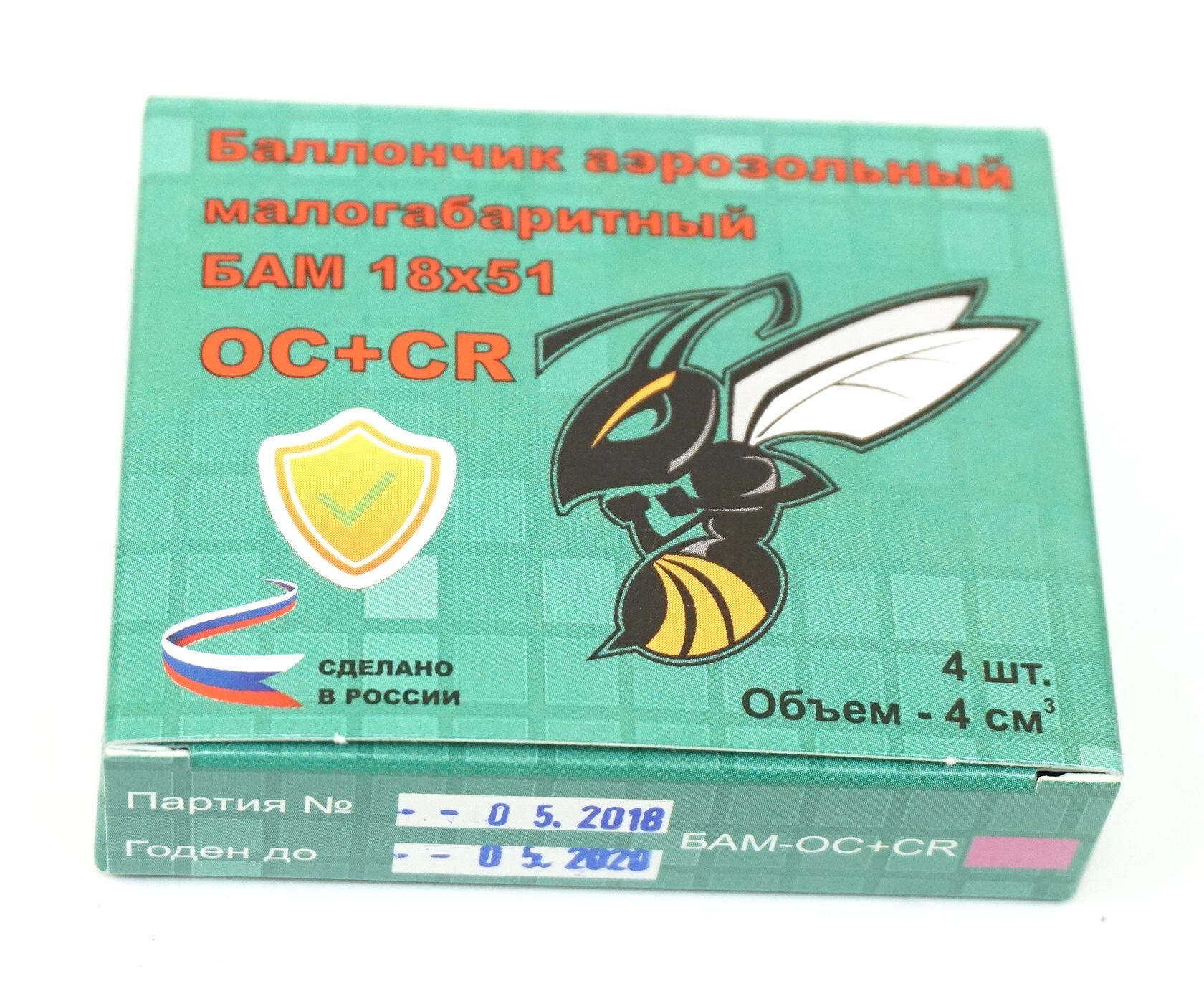 БАМ-ОС+CR 18×51 – это эффективное средство для самообороны граждан в комплексе с аэрозольными устройствами (пистолетами) «Добрыня» и «Пионер». В состав данных БАМ входит действующее вещество дибензоксазепин (CR) 1% – сильнейший из ирритантов, и экстракт жгучего красного перца – олеорезин капсикум (ОС) 6%. Запрещается разбирать и переснаряжать!