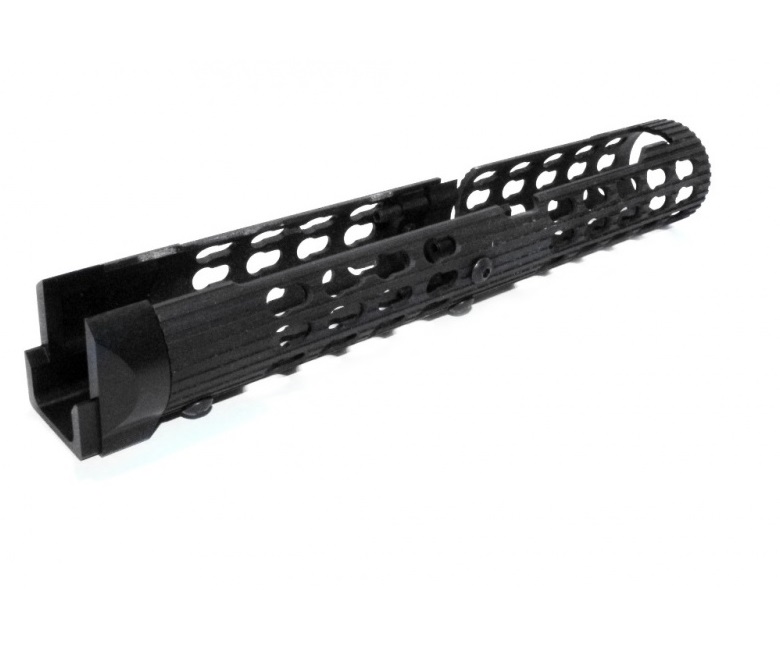 - Цевье VS-25 оборудовано системой креплений, расположенной по всей поверхности изделия. С ее помощью вы можете установить планки Pikatinny и разместить на них желаемое навесное оборудование: сошки, фонари, рукоятки, ЛЦУ и т.д.;