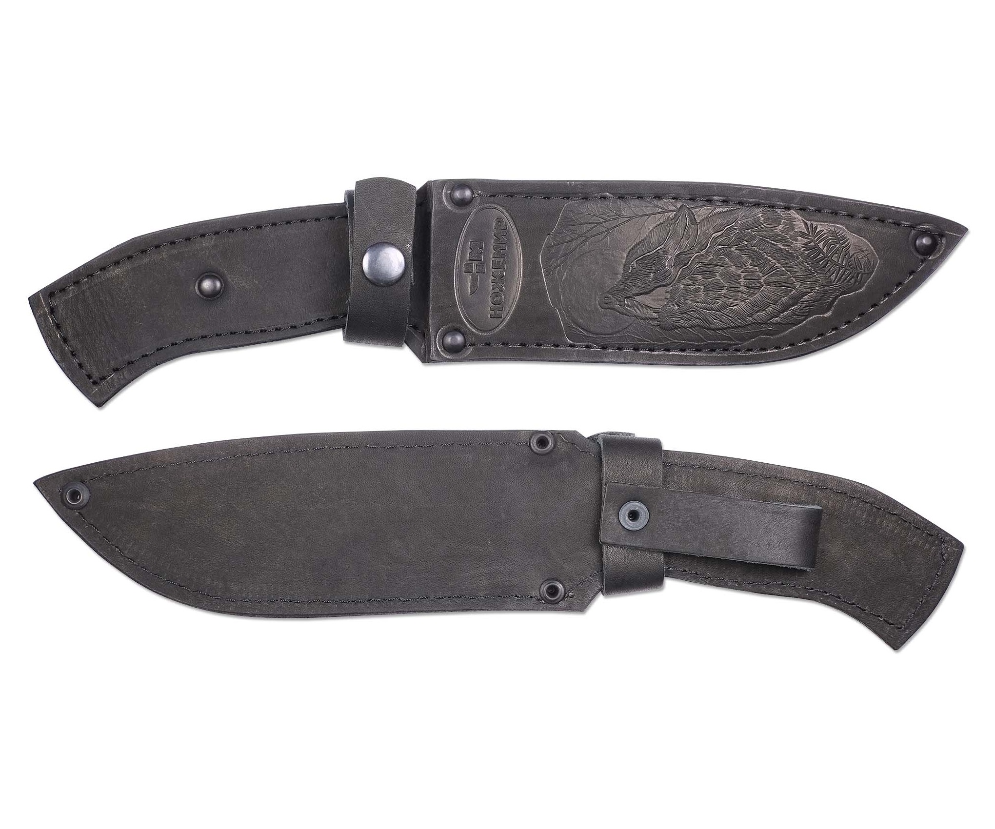 Жесткие ножны для ножа с клинком drop-point и изогнутой книзу рукоятью. Часто такими параметрами обладают туристические модели. Этот чехол идеально подойдет для них. Натуральная кожа не боится перепадов температур и высокой влажности, даже при сильном намокании она держит форму. Твердая основа предохранит ногу от случайного пореза при ношении ножен на бедре. Нож внутри крепится застежкой на кнопке. К ремню чехол присоединяется через глухой подвес. На фронтальную часть может быть нанесено любое клише с рисунком или символикой.