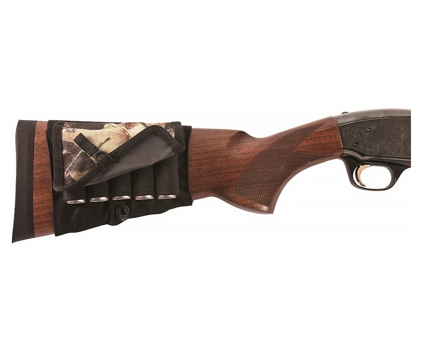 Патронташ выполнен из прорезиненного материала, данная технология обеспечивает быстрое надевание на приклад и надежную фиксацию. На патронташе нанесен камуфлированный рисунок. Ячейки под патроны выполнены из прорезиненного материала и надежно удерживают патроны.Уникальная система закрытия патронташа состоит из прорезиненной петли и крючка из прочного пластика. Данная конструкция позволяет открыть патронташ одной рукой. Открытие патронташа осуществляется беззвучно, в отличии от «липучек».