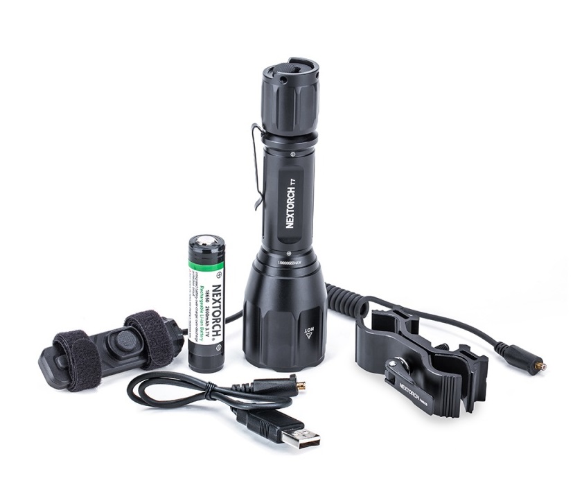 Охотничий комплект T7 — это набор, включающий тактический фонарь T7 дальнего действия яркостью 900 люмен, крепление на оружие (RM85S), выносоной переключатель (TS4-L) и 1 батарею x18650.