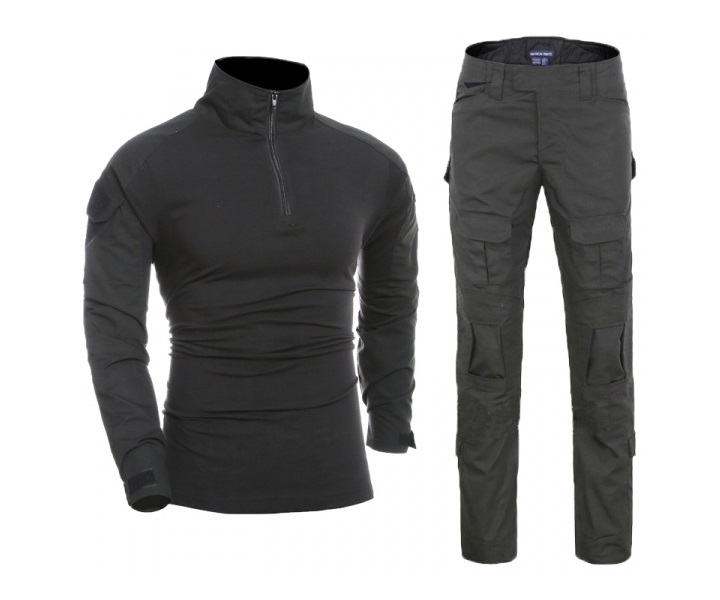 Камуфляжная униформа Combat Shirt с цветом Black относится к новому поколению, а в состав входит тактический вариант рубашки и брюк. Саму рубашку можно использовать для ношения вместе с бронежилетом или броней мягкого вида при жарком климате. Рубашка отличается основной из полимерного материала, который прекрасно обеспечивает отвод влаги и испарение. В воротнике имеется застежка «молния», а в рукавах добавлены встроенные карманы и налокотники, где нашивается вэлкро. В брюках есть наколенники, где осуществляется фиксирование при помощи затяжек на вэлкро. Еще такие затяжки добавлены внизу штанин.