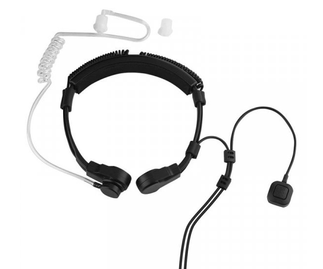 Ларингофон крепится непосредственно к шее, соединяясь с наушниками воздуховодом. Представленная модель оснащена прозрачным воздуховодом. Кнопка передачи вынесена отдельно на проводе, может быть закреплена на пальце или на одежде с помощью липучки.