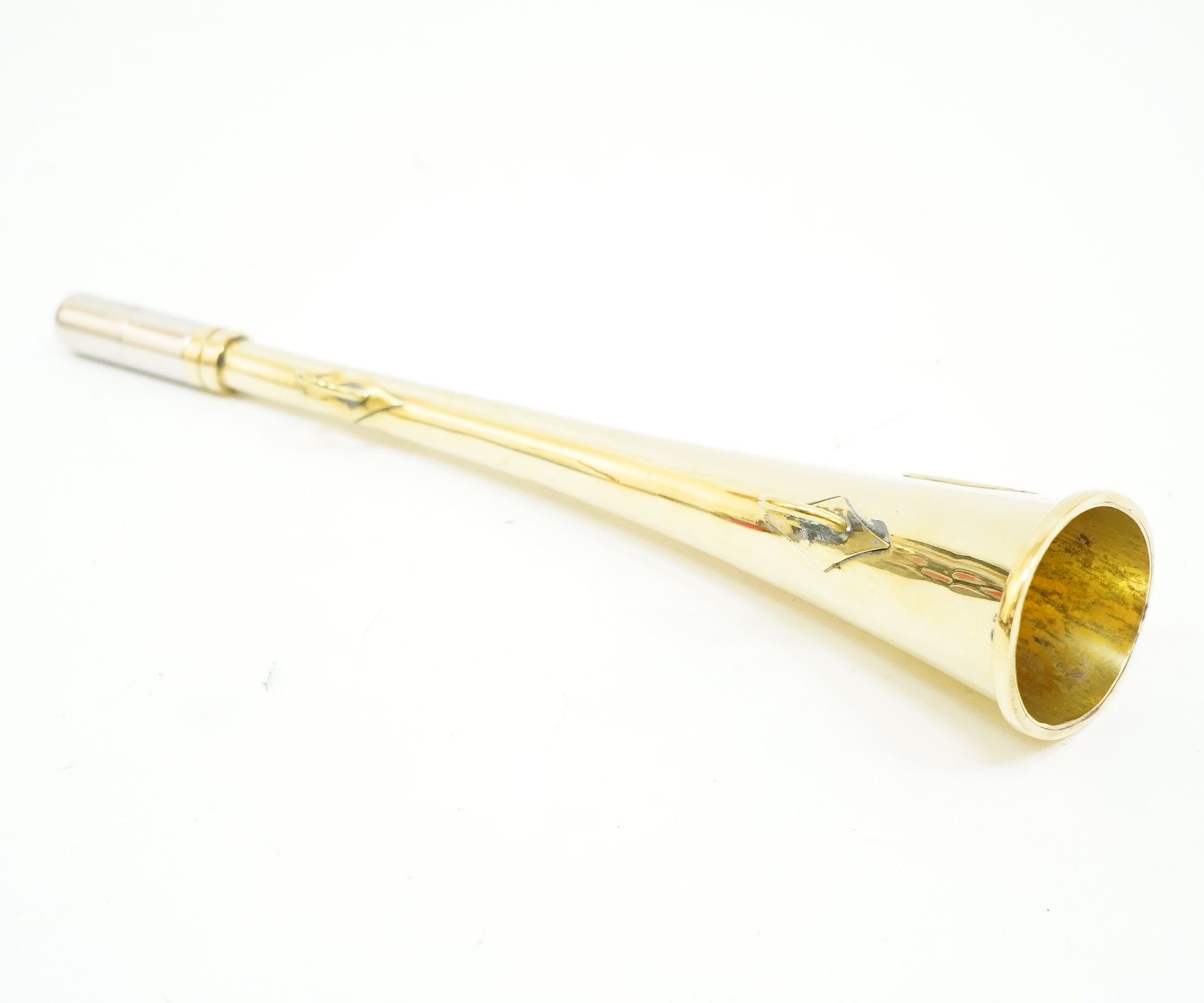 Горн длиной 25 см из латуни с пищиком предназначен для подзыва охотничьей собаки. Встроенный пищик освобождает от необходимости учиться правильно извлекать звук. Каждый охотничий рог имеет индивидуальный тон. На горне есть эмблема в виде головы кабана.