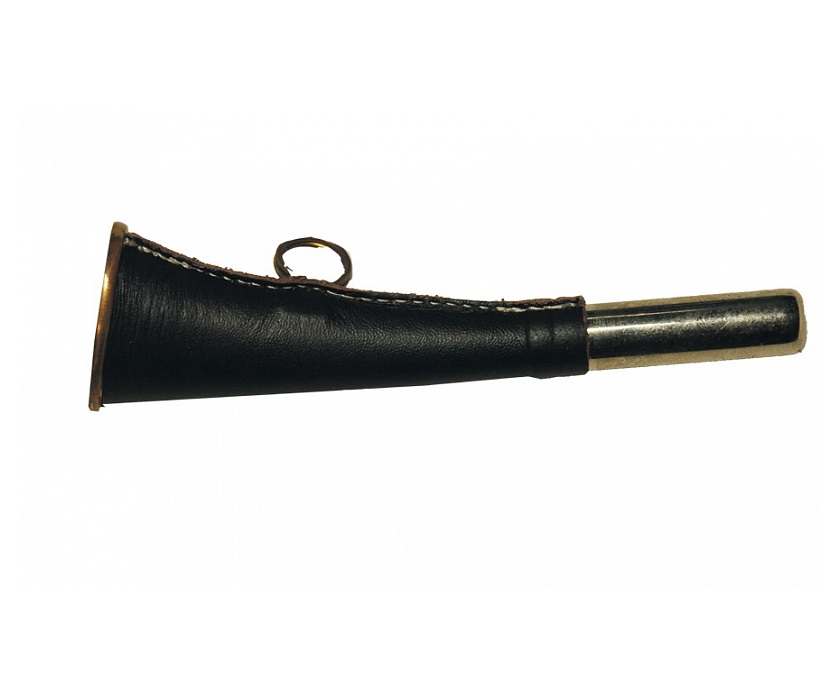 Горн длиной 16 см из латуни с мундштуком предназначен для подзыва охотничьей собаки. Встроенный пищик освобождает от необходимости учиться правильно извлекать звук. Каждый охотничий рог имеет индивидуальный тон. Изготовлен из полированной латуни и отделан натуральной кожей.