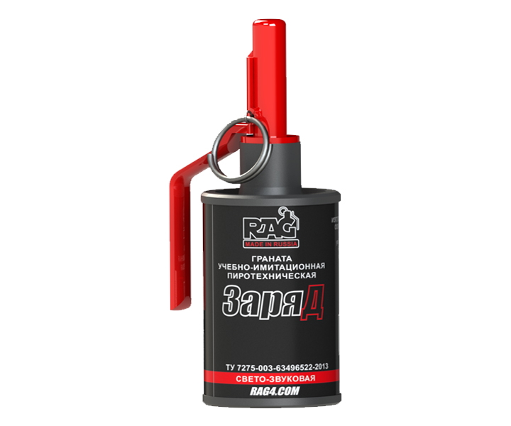 RAG «ЗаряД» наиболее громкая из пиротехнических гранат линейки RAG, применяется для имитации выстрела, разрыва свето-звуковой гранаты нелетального действия с очень громким хлопком и яркой вспышкой, используется при проведении военно-спортивных игр и обучению навыкам обращения с ручными безосколочными гранатами.