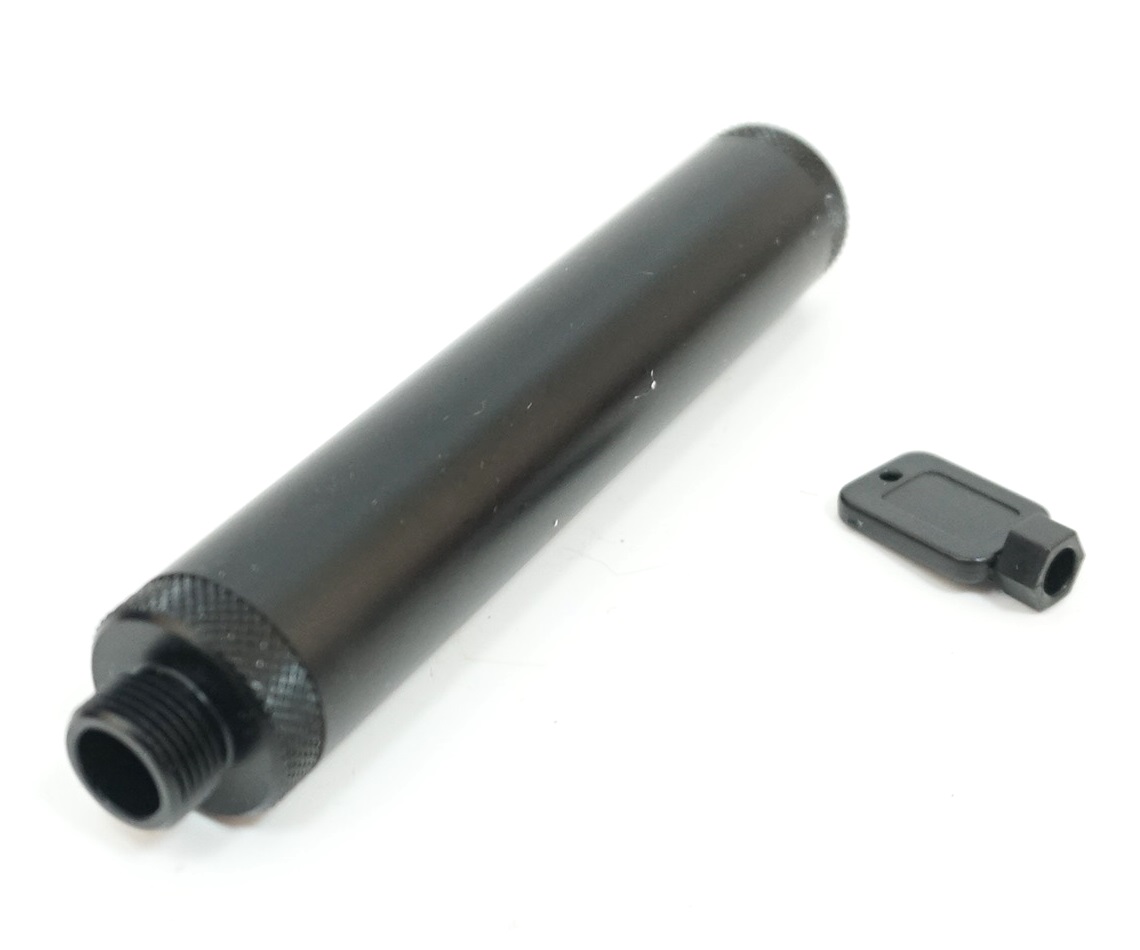 В комплекте с глушителем для пневматики идет шестигранник, с помощью которого из ствола пистолета выворачивается пластмассовая заглушка и на ее место вворачивается данный глушитель (дает чисто внешний эффект, на звук и скорость практически не влияет).