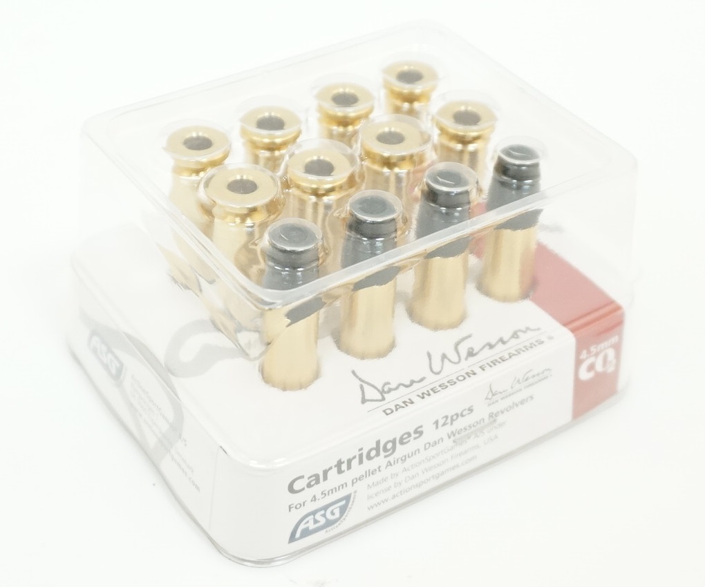 Набор из 12 картриджей (фальш-патронов) для пулевых пневматических револьверов ASG серии Dan Wesson с нарезным стволом, подойдут также для пулевых револьверов Gletcher серии SW R. Корпус картриджа изготовлен из латуни с резиновым наконечником.