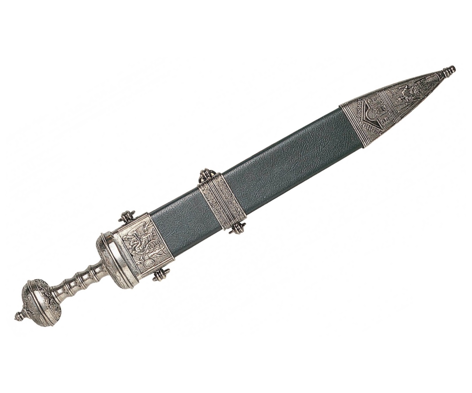Макет от испанской компании Denix выполнен безупречно, с большим вниманием к каждой детали. Остроконечный клинок длиной 25 см и толщиной 4 мм изготовлен из специального цинкового сплава, и имеет несколько тонких желобов, предназначенных в реальных прототипах для стекания крови. Рукоятка кинжала и элементы ножен выполнены из латуни. Оружие богато украшено инкрустацией с изображением римских воинов и зданий римской эпохи, рукоятка фигурная, и позволяет удобно удерживать кинжал. Ножны изготовлены из пластика, обтянутого кожей. Общая длина оружия составляет 74 см, вес с ножнами – 2,54 кг. Кинжал выглядит дорого и эффектно, в целях безопасности его использования кинжал не заточен, так что нанести им травму будет невозможно.