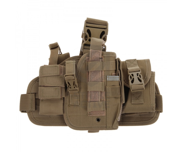 Универсальная набедренная кобура на платформе, изготовленная из кордуры. Платформа дополнительно оснащена одни гранатным подсумком и креплением для ножа. А на самой кобуре размещен дополнительный подсумок под пистолетный магазин.