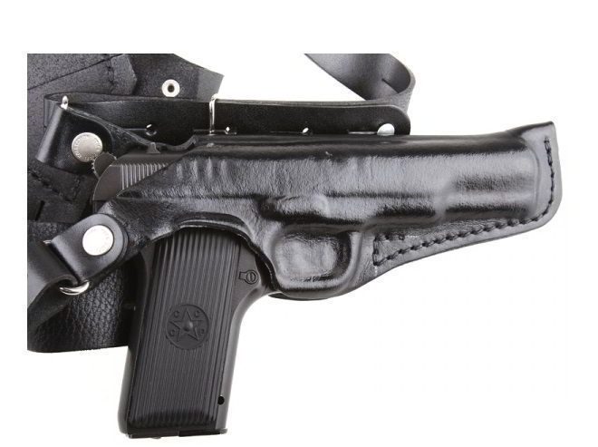 Кобура Stich оперативная для ТТ предназначена для скрытого ношения пистолетов на основе конструкции ТТ (Тульский Токарева), образца 1933 года. Кобура изготовлена из высококачественной кожи черной глянцевой окраски, с декоративным тиснением, повторяющим рельефные детали пистолета, имеет регулируемые ремни и застежку-кнопку.