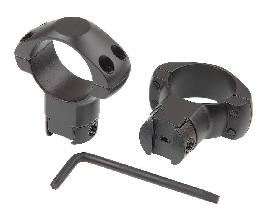 Нижняя часть колец – радиусная, плотно прилегающая к скругленной верхней части планки. Каждое кольцо фиксируется на прицеле четырьмя стальными винтами.