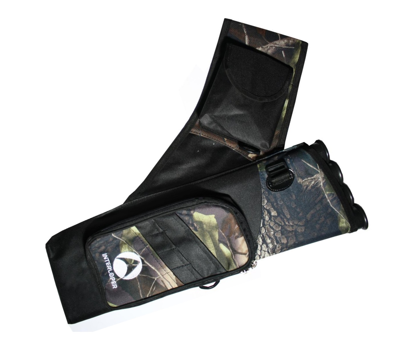 Колчан для ношения на поясе. Подходит для ношения на ремне. Имеет четыре пластиковых тубуса для стрел. Есть два кармана для лучных аксессуаров