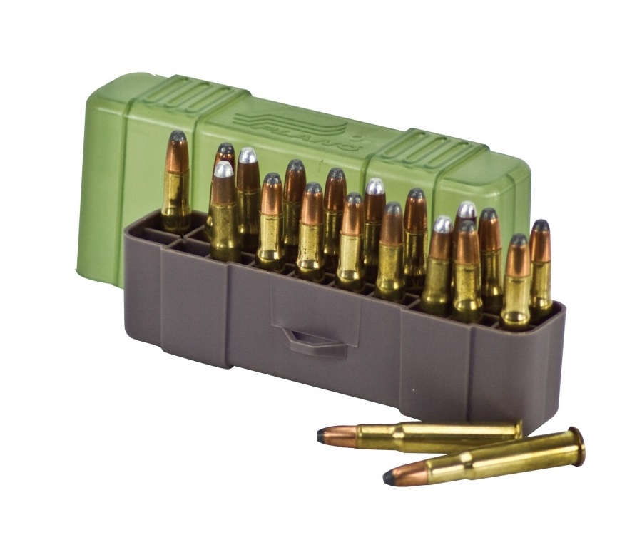 Коробка для патронов фирмы Plano — это прямоугольный футляр из ударопрочного пластика для хранения и перевозки патронов с индивидуальными ячейками вместимостью до 20 патронов длиной до 65 мм калибра 22-250, .250 Savage, 30-30 Win, .32 Win.