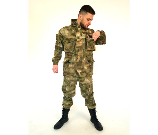 - 8 карманов: Накладной на пуговице с клапаном, усиленным закрепкой – 2шт, нагрудный вертикальный накладной карман на молнии «в листочку» — 2шт, Нагрудный накладной карман на пуговице — 2шт, Накладной на липучке на рукаве – 2шт.