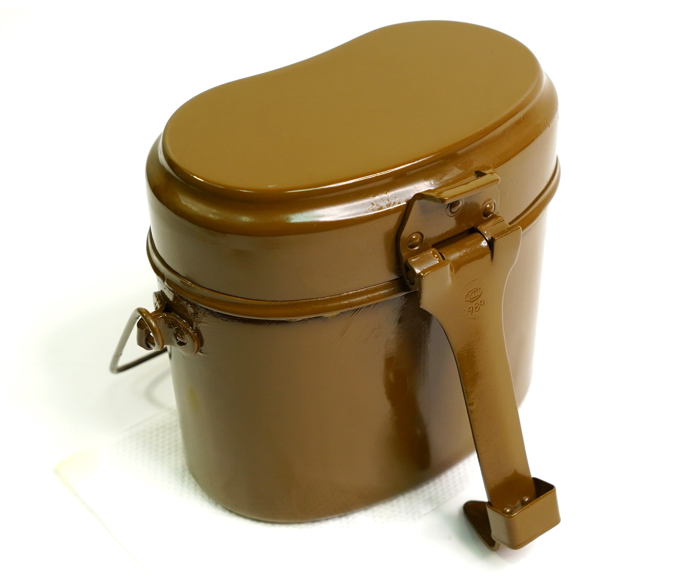 Материал изготовления армейского котелка – алюминий. Котелок плотно запирается, а его крышка может использоваться, как сковородка для разогрева второго блюда.