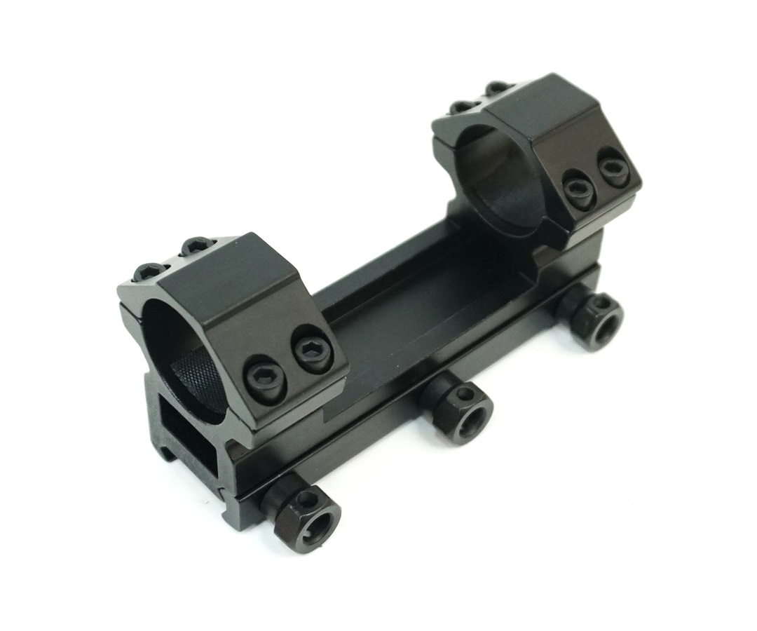 Моноблочная конструкция с общим основанием длиной 100 мм повышает жесткость и надежность системы «прицел-крепление». Внутри кольца проклеены тканевой лентой, предупреждающей повреждения корпуса прицела при монтаже. Основание кронштейна крепится к базе 3-мя стальными прижимными винтами, которые можно закрутить вручную.