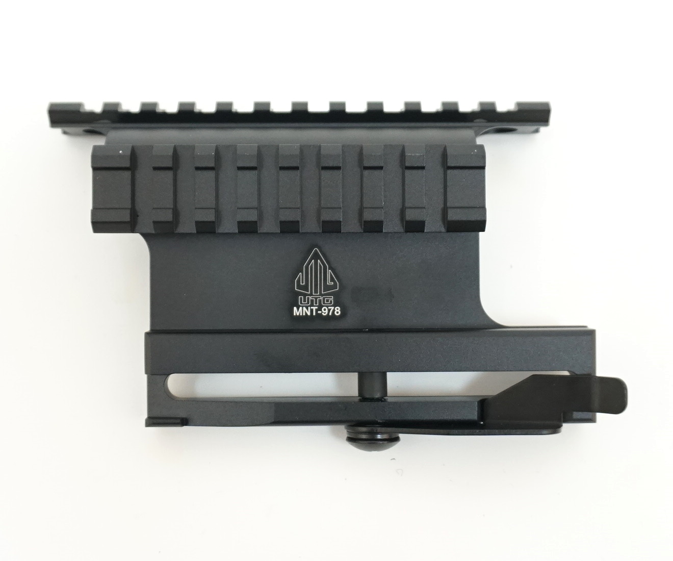 Кронштейн UTG MNT-978, аналогично кронштейну MNT-973, предназначен для перехода с бокового крепления типа «ласточкин хвост» на верхнюю планку Weaver для карабинов Тигр,Вепрь,СКС. Кронштейн имеет сбоку плаку Weaver для дополнительного оборудования. Установка кронштейна осуществляется флажковым быстросъемным зажимом.