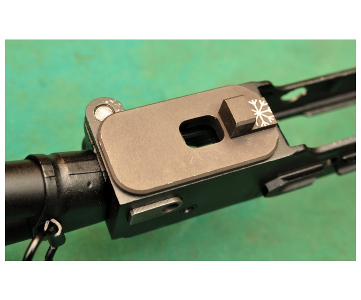 Площадка имеет сложную форму, с высокой точностью изготовлена фрезерованием и зачернена анодирование. Заготовка – болванка из В95. Это деформируемый алюминиевый сплав, содержащий высокий процент цинка и магния. Обозначение буквой «В» обозначает повышенную прочность дюралевого сплава. Цифра 95 — показатель процентной чистоты сплава. Марка В95 с легкостью поддается механической обработке. Обладает высокой твердостью. Данный алюминиевый сплав применяют при изготовлении высоконагруженных конструкций. Поэтому В95 и получил столь широкое распространение в оружейном деле.