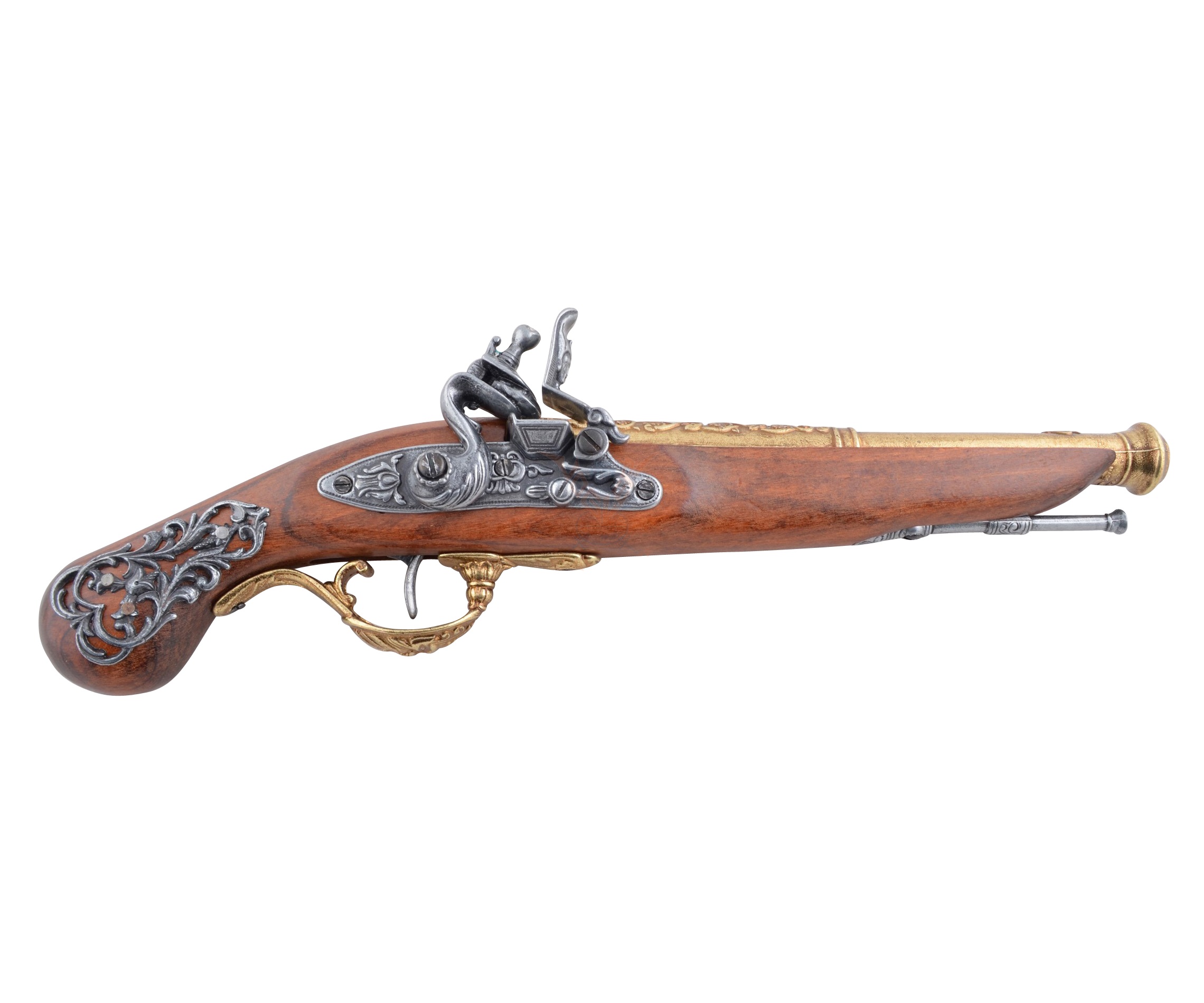Макет пистолет кремниевый, Англия изготовленный специалистами испанского бренда Denix, представляет собой великолепный образец стрелкового орудия 18 века. Все его детали выполнены в точном соответствии с оригинальными экземплярами того времени. При производстве макета использовался металлический сплав замак, латунь и натуральное дерево. Оружие отличается великолепным внешним видом, выглядит эффектно и очень достойно. Вес макета соответствует оригиналу, и составляет 0,57 кг. В верхней части деревянного ложе расположены стальные декоративные элементы, повторяющие растительные мотивы. Ствол имеет округлое сечение, под стволом закреплен обязательный элемент – шомпол. Ударно-кремниевый замок сложной конфигурации, и напоминает змею. Рукоятка украшена инкрустацией. УСМ функционирует, делая копию более реалистичной.
