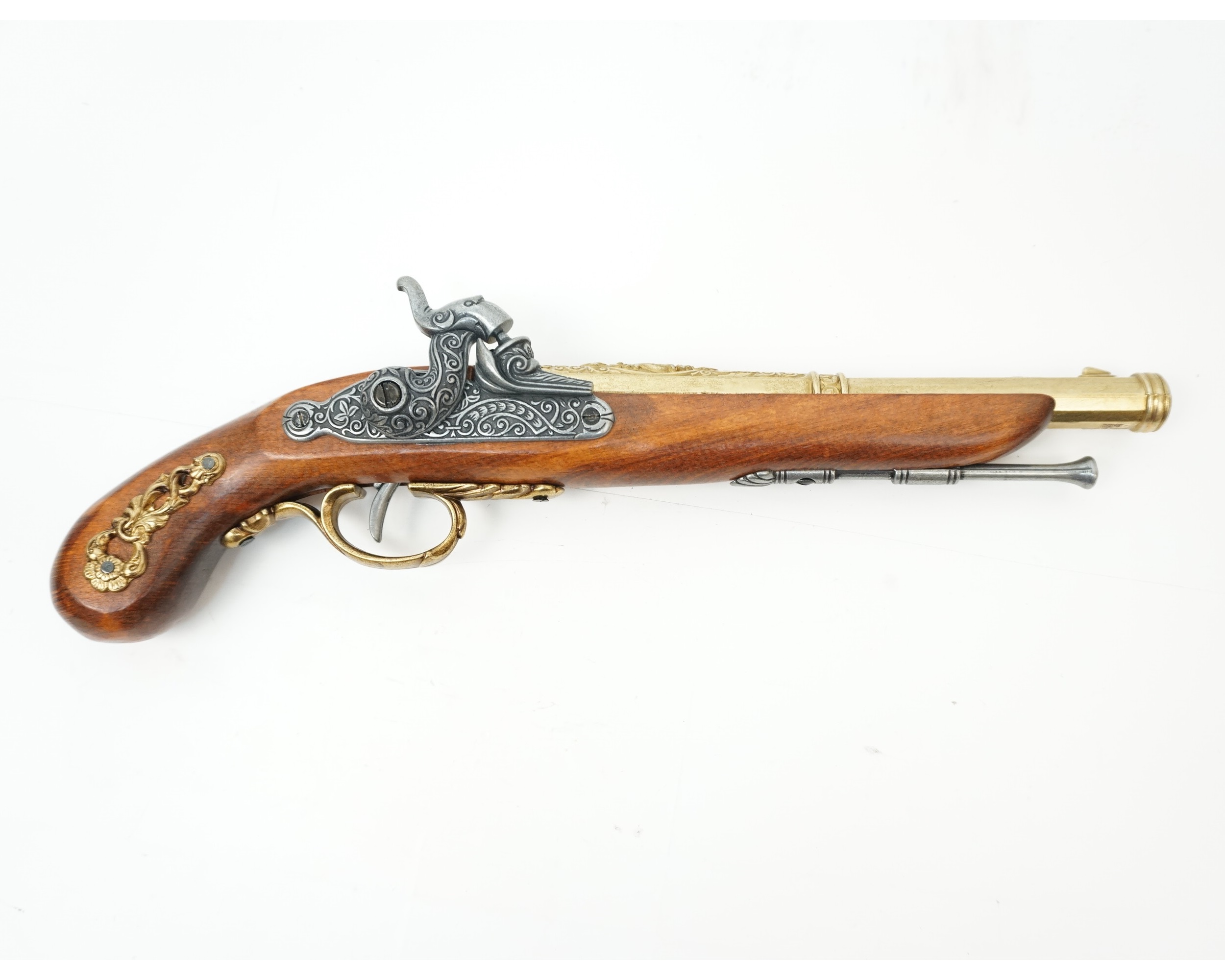 Макет пистолет кремниевый (Франция, 1872 г.) от мастеров испанской компании сувенирного оружия Denix является великолепным образцом ручной работы. Использованием цинкового сплава замак придает реплике необходимую прочность, латунь применена в данном случае в качестве материала для украшения пистолета. Ложе и рукоятка оружия выполнены из дерева. Верхняя часть ствола, а также основание кремниевого замка и рукоять украшены стальными накладками с эффектным орнаментом. Имеется шомпол, закрепленный, как и полагается, под стволом. Кремниевый замок и УСМ здесь функционирующие. Длина макета составляет 37 см, масса – 0,515 гр. Копия выглядит очень достойно и качественно, внешне практически не отличается от оригинала.