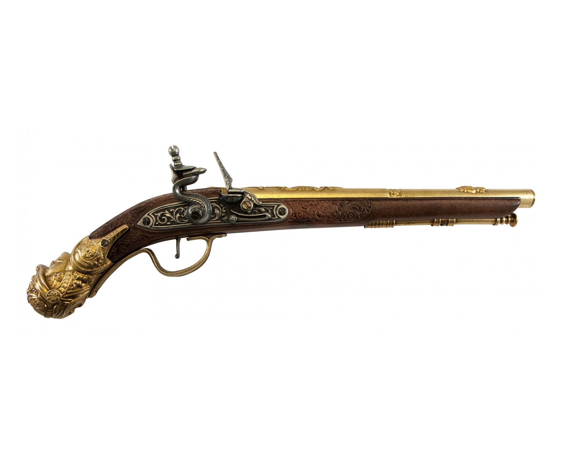 Макет пистолет кремневый, под дерево (Германия, XVII век) DE-1314 – это очень красивая реплика немецкого исторического оружия от компании Деникс. Изделие в точности копирует реальный однозарядный пистолет ударно-кремниевого типа. В 17 веке каждый мастер стремился выделить свой пистолет путем его украшения, поскольку тип оружия был практически одинаков.