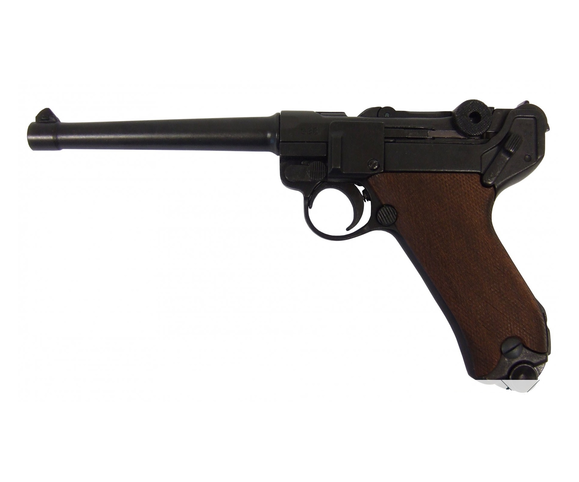 Макет пистолет Люгер Парабеллум P08 от испанской компании Denix отличается хорошим качеством исполнения и внешне максимально схожа на боевой прототип. Есть возможность передергивать затвор, спускать курок или вынуть обойму. Размеры, конфигурация и вес макета соответствуют оригиналу. Для производства этого экземпляра использован качественный сплав на основе цинка и дерево для рукоятки.