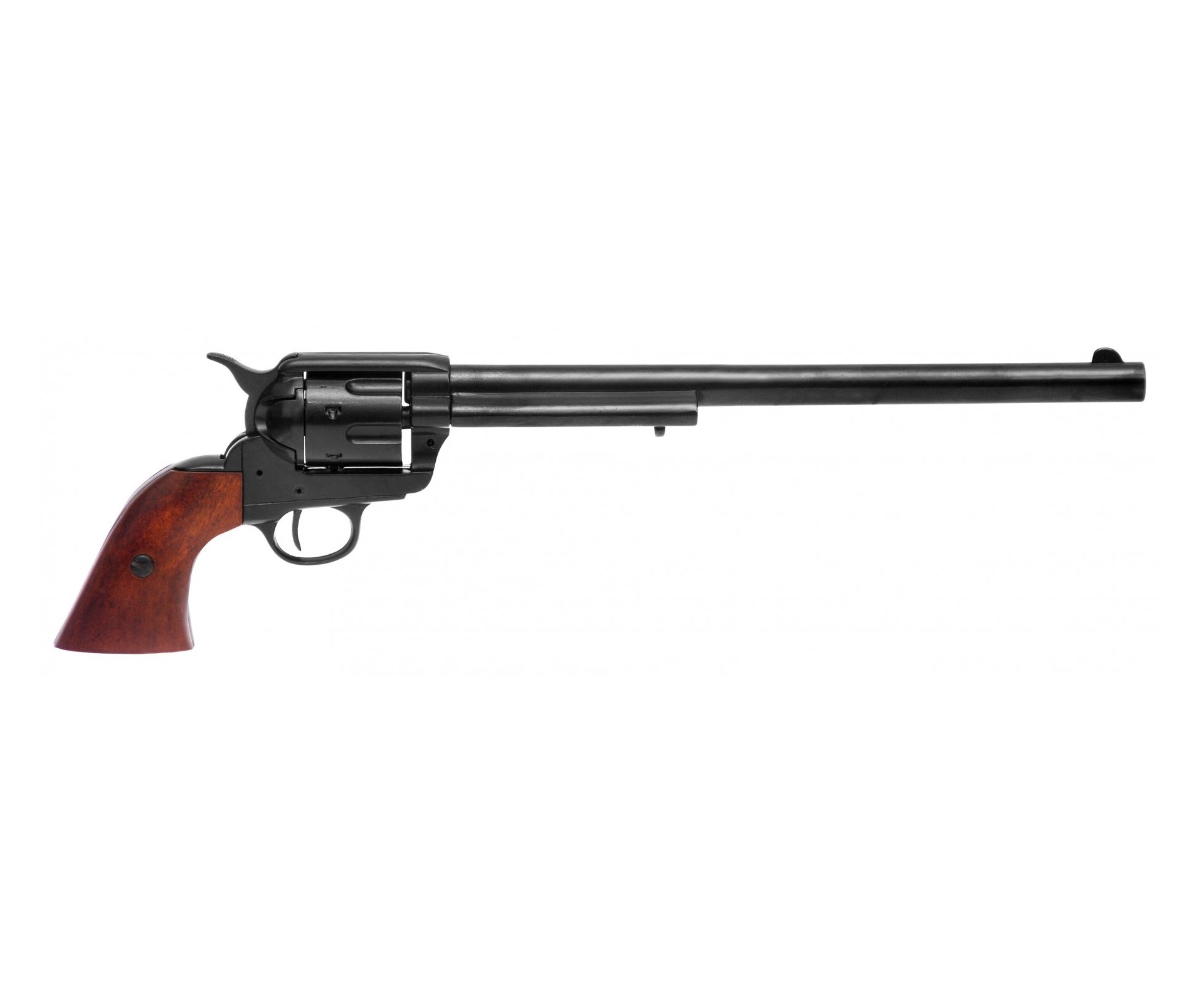 Реплика длинноствольного револьвера Colt, изготовленный из металла с деревянными накладками на рукоять. Имитация механизма заряжания и стрельбы, вращения барабана.