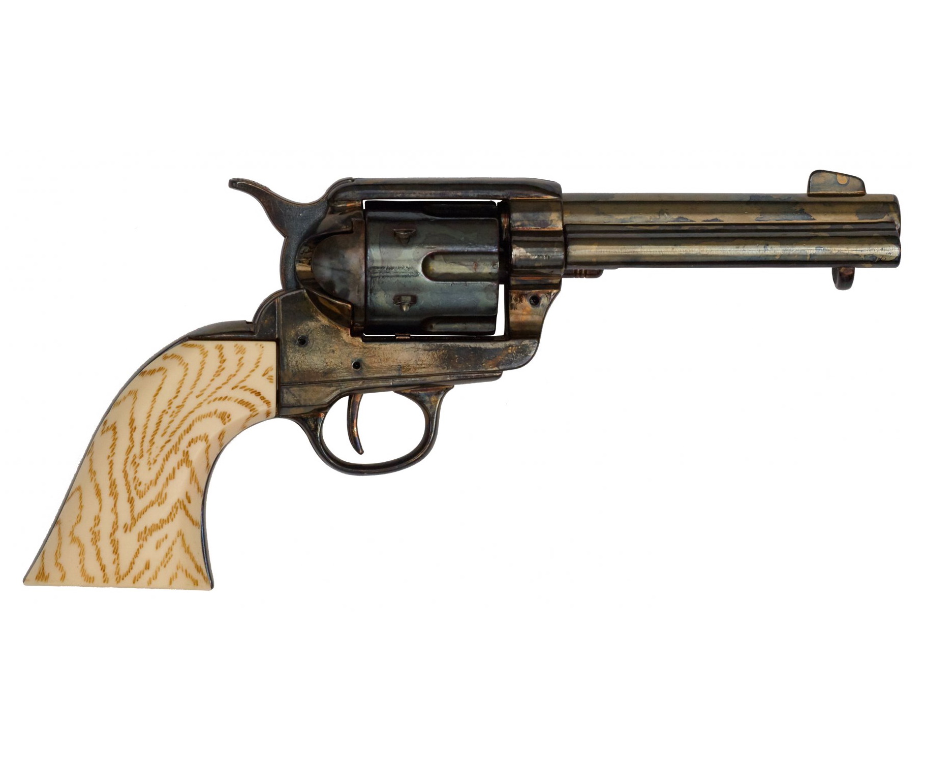 Классический револьвер Кольт 45 калибра с пластиковыми накладками под слоновую кость и искусственно состаренным стволом длиной 4,75″ дюйма, США модель 1873 года (Cal.45 Peacemaker revolver 4,75″, USA 1873). Выполнен из металла и пластика, с имитацией механизма зарядки и выстрела.