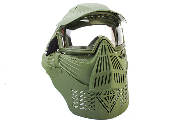 Вариант защитной маски для использования в пейнтболе и страйкболе. Отличается полным закрытием лица, ушей и частично лба. Внизу добавлен небольшой вариант накладки, обеспечивающий защиту шеи. TPU-пластик использован в изготовлении данной маски. Произведено интегрирование линзы в масочную конструкцию, состоящую из оптического поликарбоната. Можно осуществить отсоединение очков от маски. Небольшой козырек есть сверху.