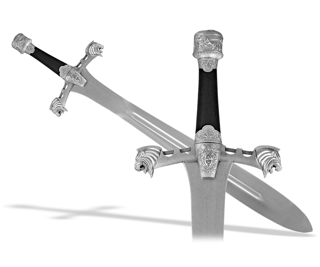 Церемониальный парадный меч Александра Македонского (Alexander the Great Ceremonial Sword old brass finish) в отделке под серебро. За основу был использован древнегреческий меч Ксифос (Greek Xiphos) и имеет широкий клинок, предназначенный для рубящего удара.