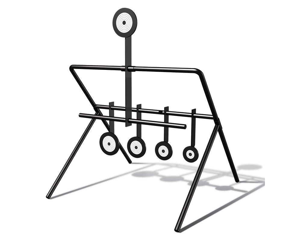 Мини-тир представляет собой, набор из пяти металлических медальонов, различного диаметра с механизмом, который обеспечивает дистанционный сброс и восстановление исходного положения мишени. Отличается легкостью, простотой конструкции и долговечностью. При правильной последовательности попадания по мишеням не требует ручной установки мишеней в исходное положение. Корпус с мишенями выполнен из стали повышенной прочности.