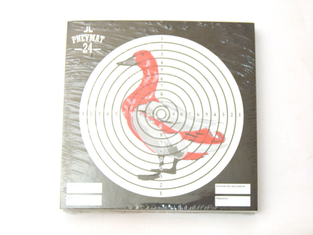Радиус мишени 6 см, радиус кружка «десятки» 6 мм, расстояние между окружностями по 6 мм. Отличается от обычной спортивной мишени тем, что вместо черного круга в центре нарисована фигура утки красного цвета, в которую и нужно осуществляеть прицеливание. Количество мишеней в упаковке: 50 штук.