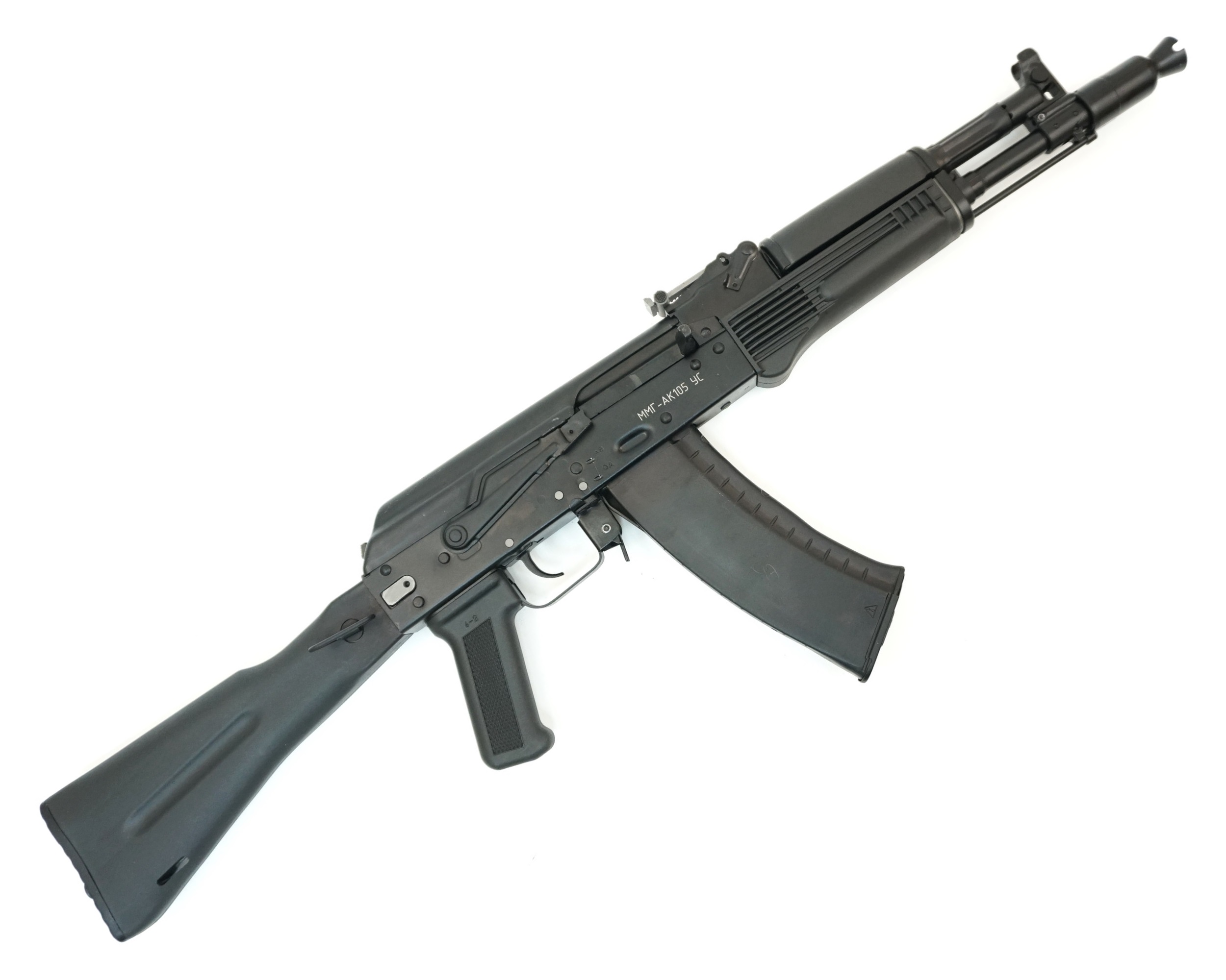 ММГ автомат АК-105, складной приклад – это копия одного из самых известных компактных автоматов Калашникова, разработанного для внутреннего рынка под штатный патрон калибра 5,45 мм. Как и все модификации «сотой» серии АК, этот автомат был разработан на основе АК-74М. Изменения коснулись длины ствола, кроме того, в дульной части ствола появилась возможность установить пламегаситель. АК-105 можно было оснастить подствольным гранатометом, штык-ножом и оптическими приспособлениями. Как и другие модификации этой серии, АК-105 получил открытые прицельные приспособления. Скорость пули у АК-105 выше, чем у АК-74М, и составляет 840 м/с. УСМ куркового типа данной модификации позволяет вести огонь и очередями, и одиночными выстрелами.