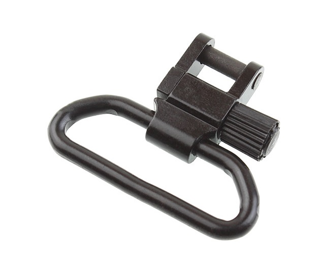 Для установки антабки, её винтовую головку следует выкрутить до упора и надавить на неё. Освободившеюся скобу следует развернуть на 90 градусов. Ось антабки следует вставить в крепление на оружии, вернуть скобу на место и завернуть винтовую головку обратно до упора.