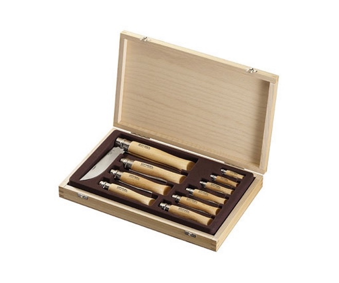 Подарочный набор ножей Opinel состоит из 10 ножей. Рукоятки выполнены из бука и пропитаны маслом. Все ножи «рабочие», могут использоваться на охоте, рыбалке и в быту. Ножи № 2, 3, 4, 5 не имеют в конструкции фиксатора лезвия Virobloc из-за своего размера и сфер применения (брелок, заточка карандаша и др.). Ножи № 6, 7, 8, 9, 10, 12 имеют фиксатор лезвия Virobloc в связи с «рабочими» их функциями (охота, рыбалка, разделка добычи, приготовление пищи и др.). Набор размещен в деревянном кейсе с металлическими застежками. В коробке имеется формованная пластиковая вставка для размещения ножей, ножи размещены в коробке по возрастающей, от №2 до № 12.