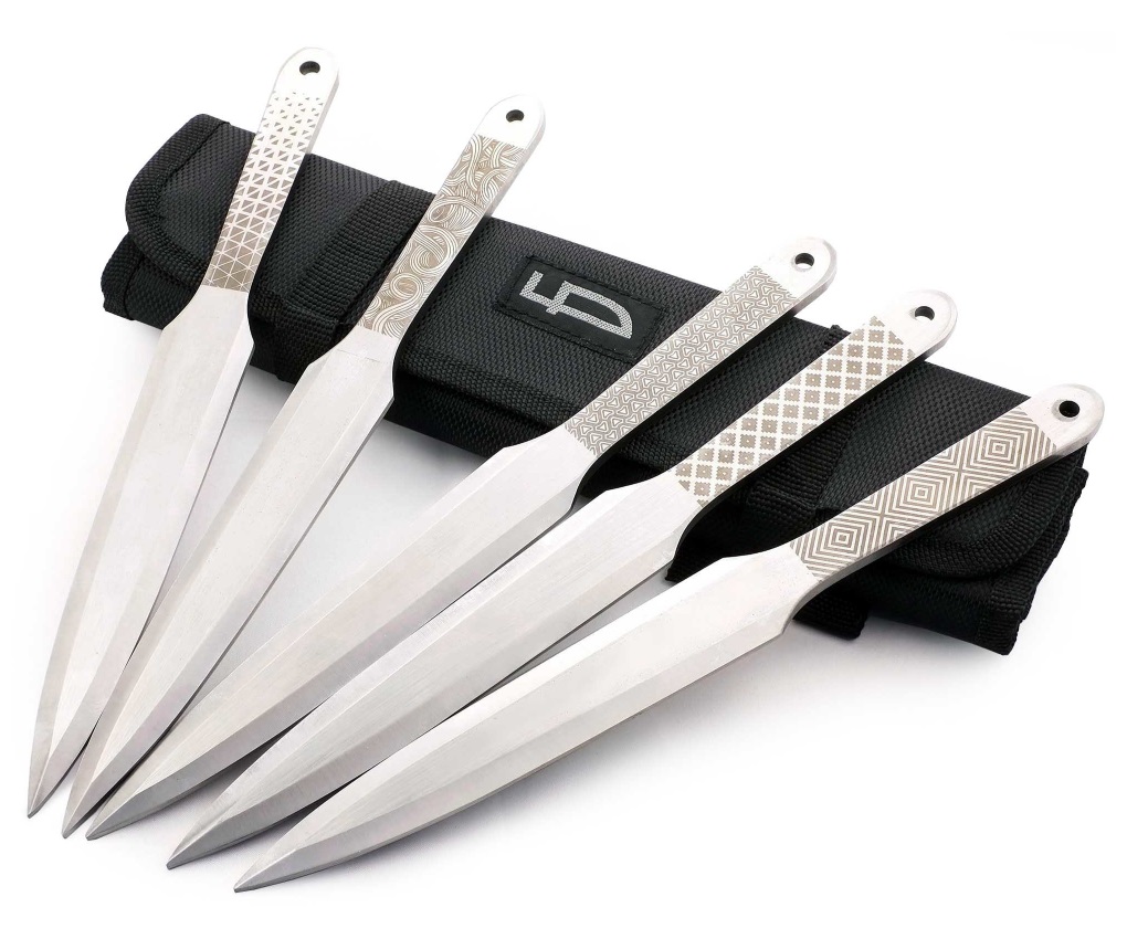 Набор из 5 метательных ножей Орнамент (M-132SU) – это комплект из одинаковых метательных инструментов, различающихся орнаментом лазерной гравировки на рукоятке. Ножи для метания М-132 SU от бренда «Ножемир» рассчитаны на новичков и любителей спортивного метания. Клинок каждого ножа полностью симметричный по оси, что способствует точному попаданию по мишени.