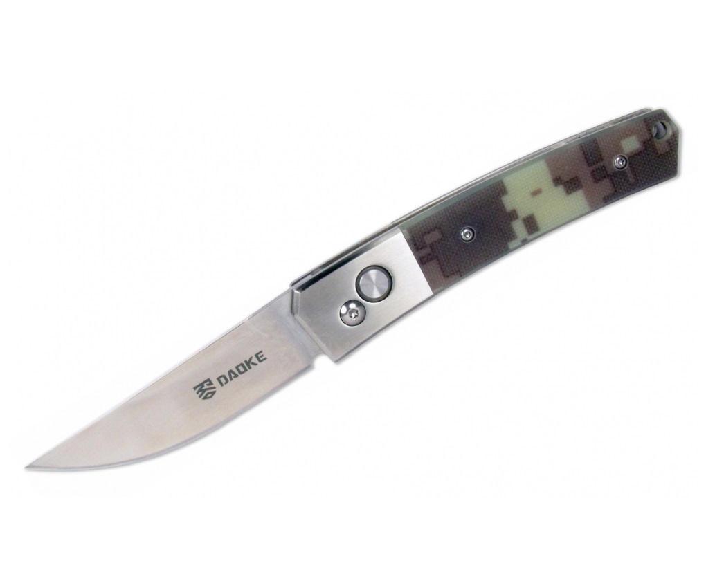 Нож складной Daoke D211c – это удобный туристический нож по привлекательной цене. Изделие имеет автоматическую конструкцию, надежную и выверенную до мелочей. Кнопка, выбрасывающая лезвие, несколько утоплена в рукоять, поэтому риск его случайного открытия минимальный.