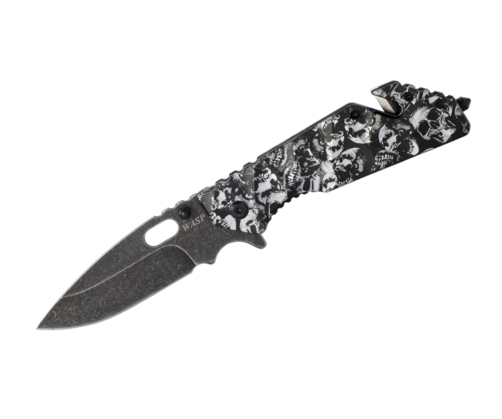 Толщина обуха 2,5 мм. Прочность ножа Wasp A-116BBS повышается за счет использования специальной технологии обработки клинка stone wash, которая, к тому же, придает изделию дорогой и эффектный вид. Поверхность пластиковой рукоятки украшена изображениями черепов, поэтому такая вещь наверняка понравится пользователям более молодого возраста. Замок liner lock обеспечивает возможность использовать функционал ножа одной рукой.