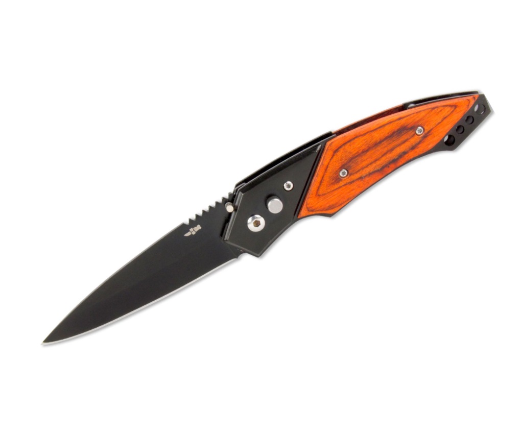 Нож автоматический «Чёткий расклад» A-133 – это инструмент из линейки классических ножей, изделие с современным дизайном и качественным исполнением. Нож А-133 отличается несколько удлиненным клинком с плавной линией изгиба лезвия. Такая форма лезвия будет удобна не только для использования ножа по прямому назначению, но также подойдет для проделывания отверстий в различных материалах. Интересно, что линия обуха этого ножа симметричная линии лезвия.