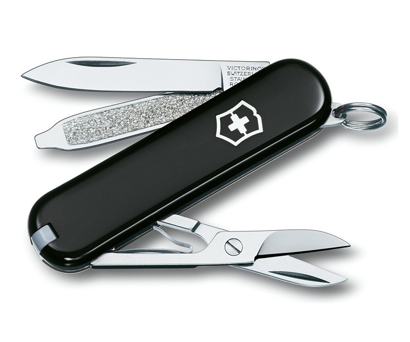 Предметы, которые входят в комплектацию представленной модели (большой нож, ножницы, небольшая отвертка, пилочка, кольцо, пинцет и зубочистка) делают этот нож незаменимым для ежедневного применения. Благодаря присутствию в конструкции особого запорного механизма, созданного швейцарскими разработчиками, этот нож не только удобен в использовании, но также безопасен.