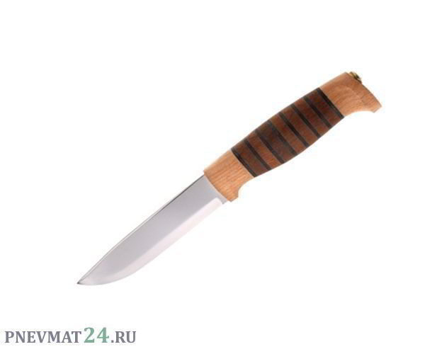 Рукоятка ножа представляет собой сложенные вместе куски дерева из дорогих пород древесины с кожаной обмоткой.