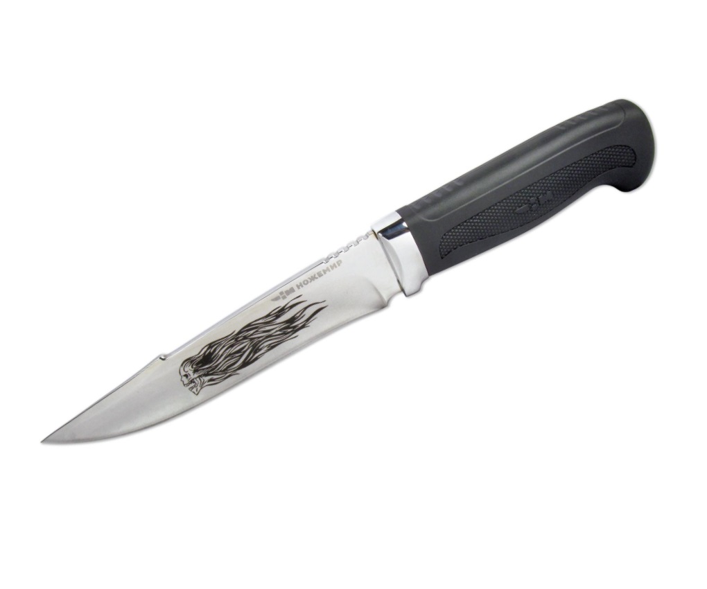 Используемые материалы: сталь 40Х13, стойкая к влаге и образованию коррозии, и эластрон – современный полимер, имеющий свойства резины и пластика, и стойкий не только к влаге, но и к воздействию химических веществ. Лезвие ножа имеет прямой обух, в верхней части обуха, ближе к рукоятке имеется зубчатый край для упора большого пальца при резе. На клинке присутствует название бренда, а также имеется гравировка в виде черепа со шлейфом пламени.