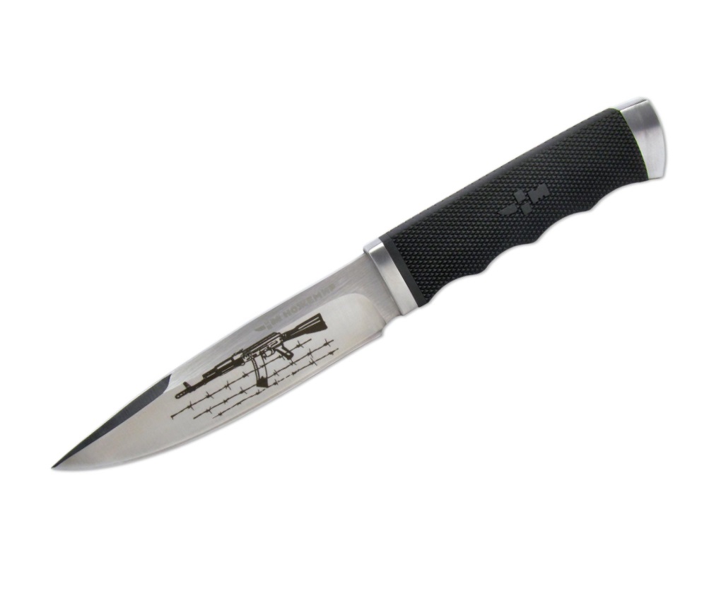 Клинок ножа имеет прямой обух, присутствует фальшлезвие в верхней части обуха. Плавный скос лезвия снизу и фальшлезвие образуют острый кончик, так что таким инструментом можно и резать, и колоть. На клинке выгравировано изображение АК на фоне колючей проволоки. Обработка клинка по методу сатинирования обеспечивает ему блестящую поверхность.
