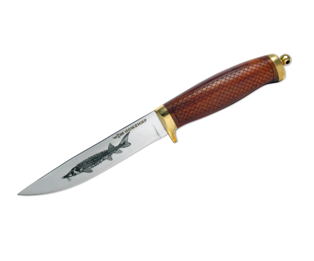 Нож имеет шикарный внешний вид, клинок с прямым обухом зеркально отполирован, что обеспечивает не только внешнюю привлекательность, но и гарантирует повышенную защиту от коррозии и загрязнений. Клинок подойдет для кола за счет острого кончика. Украшение лезвия – гравировка с изображением осетра.